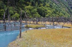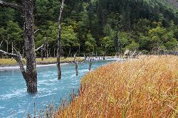 這里森林茂密,河流縱橫,生態(tài)原始,很多古樹浸泡在河水、沼澤之中,姿態(tài)怪異,神秘莫測(cè),猶如置身侏羅紀(jì)時(shí)代。傳說這里是東巴神話《創(chuàng)世紀(jì)》的發(fā)祥地。
