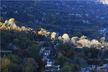 落日將最后一道霞光在山尖劃過,暗夜便裹挾這寒意搖動(dòng)起山林中的樹木。風(fēng)漸緊,那已經(jīng)稀稀落落的樹葉隨著風(fēng)的韻律,跳起歡快的鍋莊,仿佛在告別這一年的繁華。突如其來的大雪,給丹巴的二月涂上白色的記號(hào)。從山尖到院前的樹上,一溜兒雪白,正應(yīng)了“忽如一夜春風(fēng)來,千樹萬樹梨花開”的情景,讓人忍不住伸出手指看看這花是真是假。大雪過后,陽光如約而至撒滿藏寨,金色陽光和蒸騰的白霧縈繞在雪白的山頭,與山下的古碉藏寨,河畔的清流巧妙地構(gòu)成一幅絕美畫卷,讓人仿佛身處仙境。吸足了養(yǎng)分的柳樹終于抽出綠芽送來春天的信號(hào),那柳條兒在細(xì)風(fēng)吹拂下宛如少女對(duì)鏡梳妝,在陽光下顯得無比溫柔,讓人不禁想貼近它們,感受這溫暖又靜謐的溫柔。