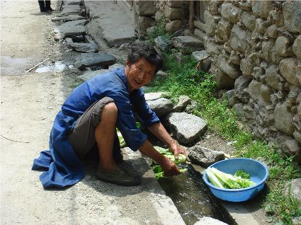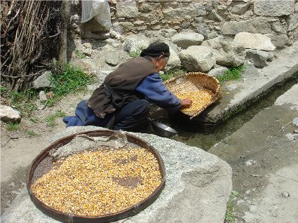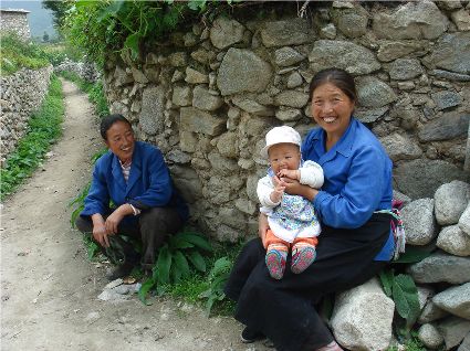 那天清晨,我們一行就乘坐曉雨哥所開轎車從康定城出發(fā)了。從顯得很懸的山路上到位于山頂平壩的嵐安古鎮(zhèn)時(shí),才8點(diǎn)過一點(diǎn)。朝鎮(zhèn)里走去,先后見到了從地里背洋芋回家的小孩、從地里收了豆菽枯藤的中年人等。