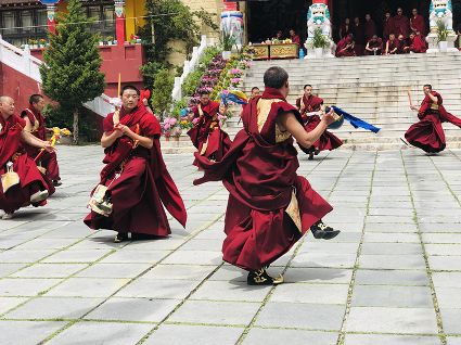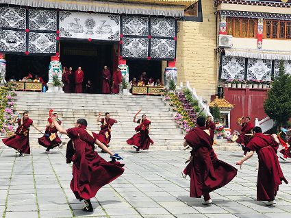 跳神儀式開始,南無寺內(nèi)鼓號齊鳴,喇嘛身著顯耀盛裝,點燃新綠松枝,幾縷藍色煙紋升起。一支由法鼓、鈸、海螺、法號等組成的寺廟樂隊自大殿而出,順時針繞場一周落座場邊,群神出場繞圈而舞,以示凈化場地,祈請諸神入位。接著,象征護法神舞、骷髏舞、鹿神舞、黑帽咒師舞和金剛力士舞的演員手持各類法器挨個入場手舞足蹈。舞蹈的起落根 據(jù)場邊奏響的器樂節(jié)奏進行。最后由眾神驅(qū)鬼逐邪,押送“朵馬”(由糌粑捏成用以供神施鬼的食品)至寺外拋丟焚燒,以示驅(qū)逐一年的邪魔,祈禱來年安樂。