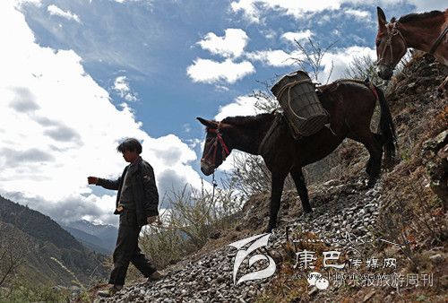 這是318和317國道都不通過的甘孜州白玉縣,從白玉縣城通往建設(shè)鄉(xiāng)德沙村的路是一條木制棧橋,2014年5月4日的中午,兩頭騾子在300斤石料的重壓下踩斷了中間的橋板,兩條前腿從踩碎的木板處懸著,騾子發(fā)出粗壯的喘息聲,無法掙扎,不能動(dòng)彈。棧橋上有路過的藏民,手中旋轉(zhuǎn)著轉(zhuǎn)經(jīng)筒,他口中念念有詞:騾子啊,你還沒有得到解脫。一群來自外地的游客都很驚詫。​ ​騾子運(yùn)輸隊(duì)的王玉海,在過往行人和同行的騾隊(duì)鄉(xiāng)親的幫助下,先卸下騾子身上背負(fù)的碎石,然后手伸到騾子前腿根處,用力抬起騾子的前身。在查看騾子沒有受傷后,王玉海把這兩只騾子牽到騾隊(duì)最后面,然后,引著另外5只負(fù)重的騾子,從橋靠左邊的雙層木板橋面上通過,騾子隊(duì)受到驚嚇,不愿意上橋,王玉海安撫了一會(huì)兒騾子隊(duì)后,在同伴的協(xié)作下,前面牽引,后面驅(qū)趕,終于,王玉海的7只騾子過橋,其他8個(gè)同伴的50多頭負(fù)重的騾子也一一通過。