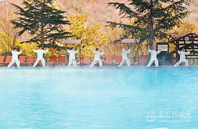 游客在天然溫泉邊做康養(yǎng)運動。