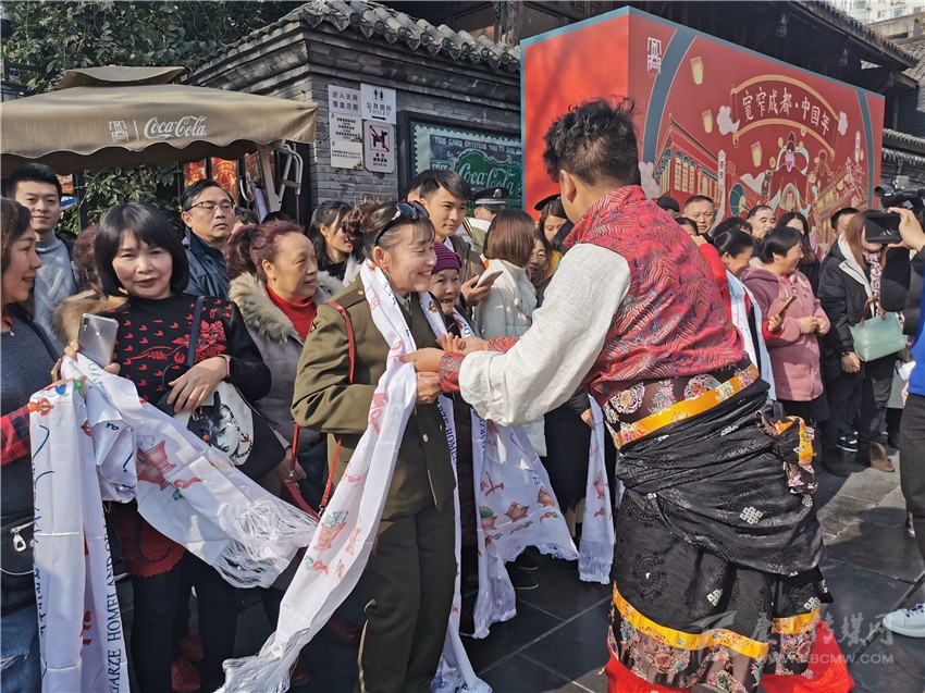 快閃還未開始,20名身著少數(shù)民族服裝的藏族姑娘小伙,便成為了一道最獨特、亮麗的風景線。隨后,他們給游客們帶來了獨具甘孜特色的歌舞《康定情歌》《甘孜踢踏》,悠揚的歌聲、奔放的舞步,讓圣潔甘孜大美天成的獨特風韻完美展顯,吸引了春熙路如潮的人群,被歌舞魅力感染,不少市民隨著他們一起唱跳了起來。而此時的成都寬窄巷子里,也正在演繹著一場震撼的“快閃”,四名穿著格薩爾王服飾的大將,身披鎧甲、手持刀劍,格外威武帥氣,市民和游客紛紛拿出手機拍照留念?!翱扉W”結(jié)束后,熱情的甘孜兒女為周邊的觀眾獻上潔白的哈達,向他們致以美好的祝福,并誠摯歡迎他們到甘孜旅游。