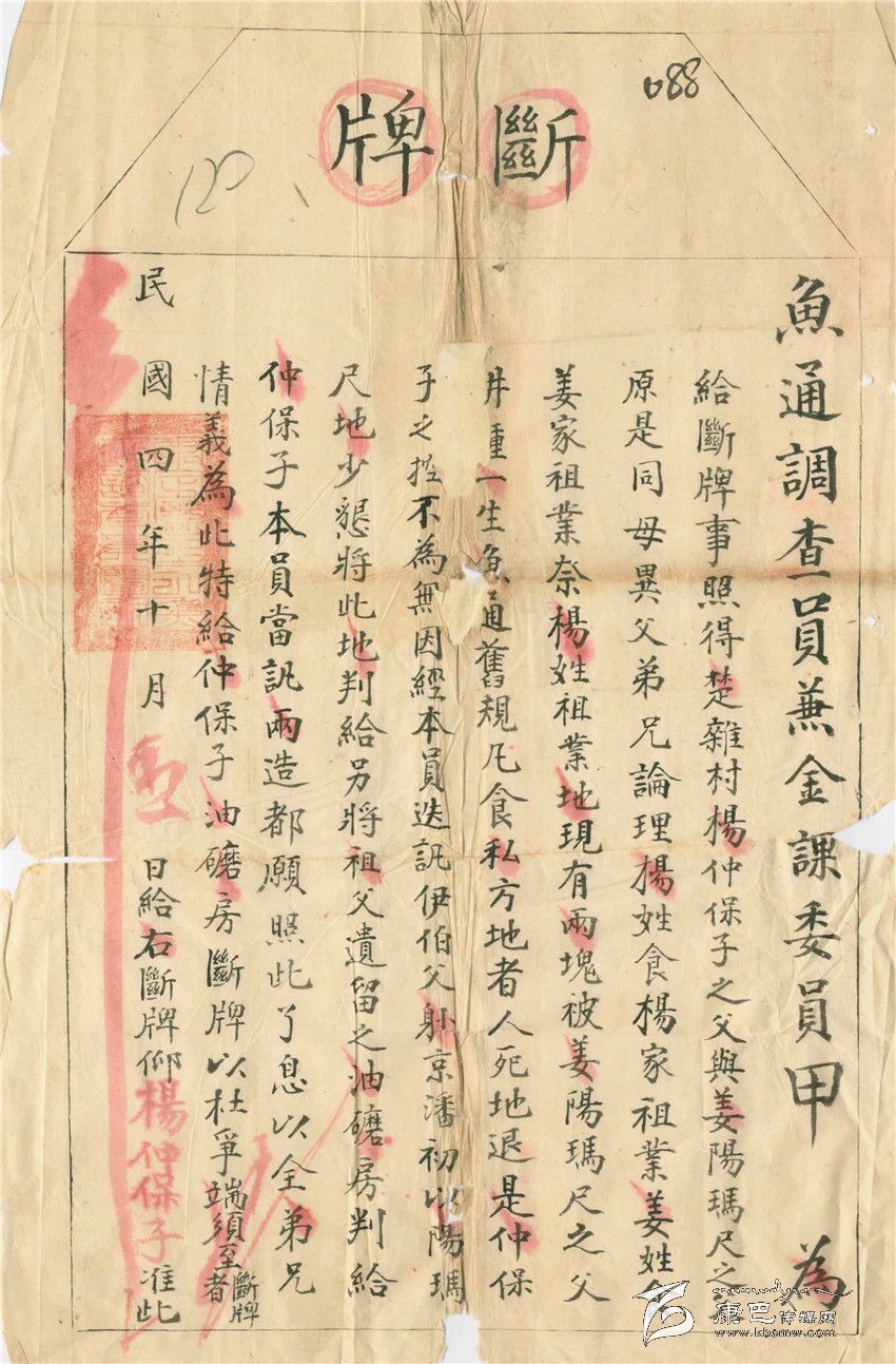 這張“斷牌”說的事情發(fā)生在“民國4年”(公元1915年),用今天的眼光來看應(yīng)算是一件“民事糾紛”。在一處地名“楚雜村”的地方,一個叫“楊仲保子”的人和一個叫“姜陽瑪尺”的人因為耕地所有權(quán)的事發(fā)生了糾紛。這兩個人其實是同母異父的兄弟。為了平息兩個人之間糾紛,也是為了保全兄弟情誼,又從公平角度出發(fā),甲調(diào)查員就把一處“油磨房”斷給“楊”姓所有。事情就這么斷了,為了防止以后再為這事發(fā)生糾葛,甲安仁調(diào)查員就發(fā)出了這樣一張可以作為“憑證”,其實是在當(dāng)年的那種情形下具有法律效力的“證書”。