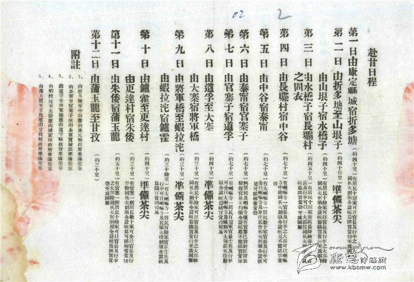 為了安排好戴院長一行的行程,西康建省委員會(huì)專門發(fā)出了一份“訓(xùn)令”。這份時(shí)間表就是根據(jù)“訓(xùn)令”要求為戴院長行程作出的安排。每天從何地到達(dá)何地,里程多少,休息地有無村莊、寺廟,接待力量如何、是進(jìn)房屋休息還是支帳篷都有說明,而且對(duì)沿途各縣各地提出了包括應(yīng)準(zhǔn)備柴草、應(yīng)在哪些地方準(zhǔn)備“打尖茶”(午飯)等具體要求。