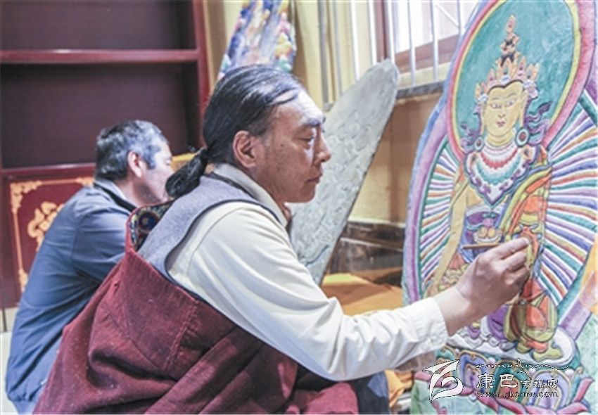 從子承父業(yè)再到吸眾家之長(zhǎng),自離開(kāi)故鄉(xiāng)的那天起,巴德的視野開(kāi)始變得開(kāi)闊起來(lái)。1979年到省藏校學(xué)習(xí)藏文和美術(shù),并開(kāi)始涉獵泥塑技藝,隨后又向德格民間藝人扎西澤郎學(xué)習(xí)彩繪石刻,然后又到西藏、甘肅等地學(xué)習(xí)繪畫(huà)、石刻技藝。巴德說(shuō),自己之所以有今天的藝術(shù)造詣,是因?yàn)橛幸慌麕熤更c(diǎn),是因?yàn)樽约旱牟粩嗵剿骱烷L(zhǎng)期堅(jiān)守。讓他欣慰的是,自己的三個(gè)兒子都在學(xué)習(xí)石刻和繪畫(huà),親戚朋友中的十多個(gè)孩子也成了他的入門弟子。