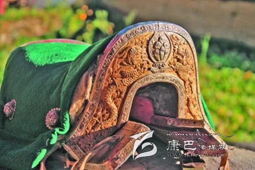 道孚縣八美鎮(zhèn)雀兒村拉姆收藏的二龍戲珠圖案馬鞍