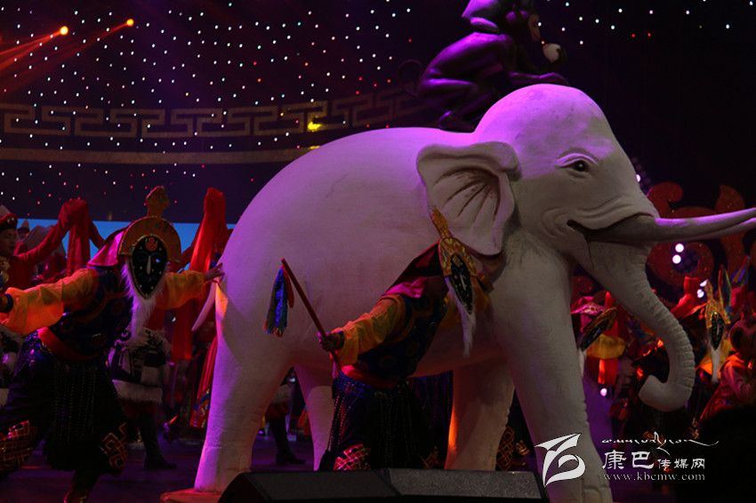 此次藏歷新年春晚被命名為“圣潔家園”,為了應“家園”這個景,導演組頗有“心機”的將藏元素“和睦四瑞”搬上了舞臺,在開場舞中,兩個用石膏打造的、栩栩如生的“和睦四瑞”被演員緩緩推上舞臺,贏得觀眾陣陣歡呼。在民間傳說中大象、猴子、白兔、貢布鳥共同發(fā)愿行持善法,貢布鳥鼓勵同伴們開始持守五戒,并一直堅持不懈動員其它眾生嚴守五戒。在它們帶動、勸說下,動物們都能漸漸做到互不損害、如理如法在木森林中和平度日,以其厲行善法之因,天人也降下和合雨水。后來,整個大地之上,莊稼豐熟、植物茂密、鮮妍之花滿目盛開,整個國家喜獲豐收、財富圓滿。晚會也是想利用“和睦四瑞”寓意人民生活團結和睦、和平寧靜的美好愿望。