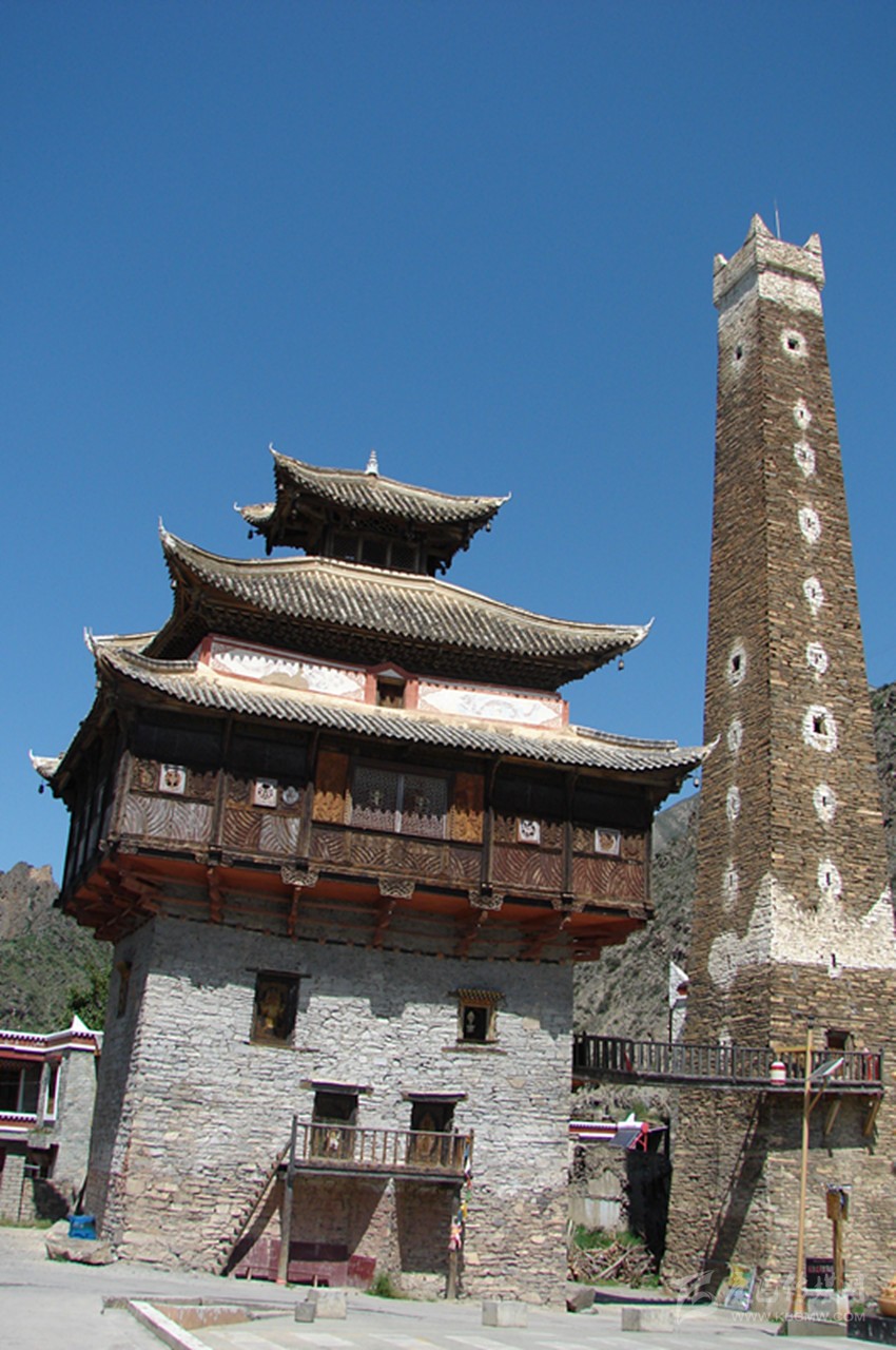 站在廣場中央仰望,碉樓有十五層高,約有二十余米,其外墻為片石壘砌,并附建有經(jīng)堂碉及過街樓,防御性極強。整座碉樓在修建中,層層收分,從墻面往上看,傾斜面在八十度左右。到達(dá)碉樓頂,面積只有四平米左右,在每一層樓里,都有外窄內(nèi)寬的窗戶,是典型的堡壘式射擊孔。在通往碉樓頂?shù)拿恳粚臃块g內(nèi),都有一根獨木梯連接著。第一層為石材壘筑的實心體,這種建筑方式為碉樓下大上小、重心向內(nèi)、穩(wěn)定性強的特點奠定了牢固的基礎(chǔ)。碉樓內(nèi),水源路網(wǎng)環(huán)環(huán)相通,倉儲空間很大。第二層為放置日常用品的地方,房門開在第三層,連接地面的依然是一根獨木梯,若遇敵人來犯時,人們便從獨木梯上攀援而上,再將獨木梯抽取。這樣,一座碉樓就固若金湯,只需從射擊孔中射出箭,或者從碉樓頂?shù)乃慕侨酉乱粔K塊巨石,不管敵人是如何的孔武有力,還是擁有如何的謀略,在碉樓面前都會束手無策,最后只能選取最原始的進(jìn)攻方法——圍而不攻。坐待碉樓里的人彈盡糧絕之日,不過,人們在修建碉樓時,已充分的考慮了這些因素,在每一層樓里都儲備了足夠幾年之需的食物和水,這樣,往往是圍攻的人耐不住性子,最后只好悻悻然退卻。