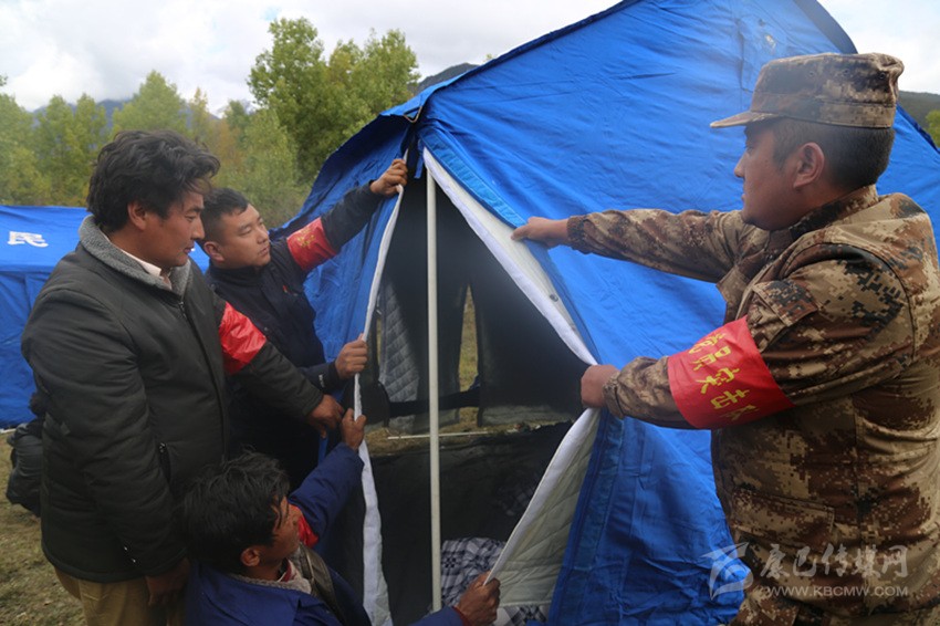 應(yīng)急救援人員在安置點搭建帳篷。