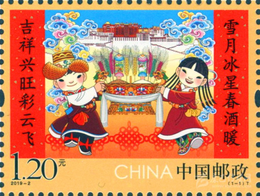 彰顯中華民族特有人情味的拜年郵票。拜年是我國春節(jié)的主要習(xí)俗,是中華民族優(yōu)秀的傳統(tǒng)文化,是人與人之間情感凝聚和維系的重要禮節(jié),具有獨特人情味。中國郵政從2015年至2019年連續(xù)發(fā)行了五組“拜年”系列郵票。2015年中國郵政發(fā)行的第一組《拜年》郵票,以其獨特的卡通風(fēng)格和濃郁的民俗特色,展現(xiàn)了人們過大年,拜大年時的喜悅場景。2018年正好是廣西壯族自治區(qū)成立六十周年,中國郵政發(fā)行  《拜年》郵票,畫面展現(xiàn)了壯家人過年時熱情好客的場景,桌子上擺放著柚子、香蕉、五色飯等當?shù)靥厣褪澄?,打開的石榴籽粒飽滿、顆顆相抱,正如我國56個民族緊密團結(jié)在一起,形象貼切地體現(xiàn)了習(xí)近平總書記提出的“各民族要像石榴籽那樣緊緊抱在一起”的教導(dǎo)。  2019年春節(jié)恰逢與藏歷新年同一天,中國郵政發(fā)行的《拜年》郵票,郵票主圖畫面上“歡歡”與“喜喜”兩名藏族兒童,身穿藏族的盛裝,在布達拉宮前載歌載舞,整個畫面展現(xiàn)了藏族同胞歡快愉悅,喜慶新年的畫面,同時也表達了全國各族人民在黨的領(lǐng)導(dǎo)下,幸福生活,共筑中國夢的美好寓意。