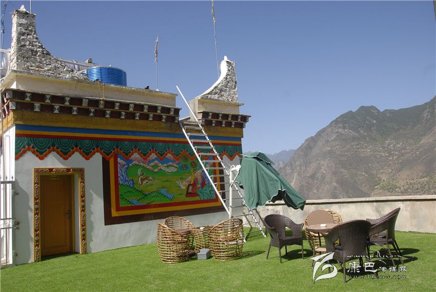 客棧的設(shè)計(jì)完全是藏式風(fēng)格,很吻合楊荻給客棧起的名字:圣地映像。從大廳開始一直到客房,金碧輝煌、雕梁畫棟,每一處空間都被藏地色彩充滿。樓頂,視野開闊,左手青山,右手青天。幾個(gè)內(nèi)江來的客人已在客棧呆了好幾天,他們正在燦爛陽光下商量爬山的事,他們一再和楊荻碰面,希望晚上回到客棧能吃上本地的土雞。