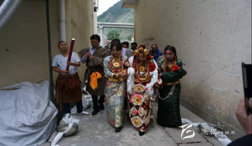 接親。除表現(xiàn)主人的熱情、好客、大方外,還要講究氣派,顯富有、高檔次、高規(guī)格。以娶親為例,舉行婚禮的當(dāng)天,男方要組織數(shù)十匹馬隊或高檔汽車接親,披金掛銀,蔟新華麗。接親的馬隊從新娘家出發(fā)后,男方要在家或路過人家必經(jīng)之地設(shè)置吉祥物,如盛滿一桶水或鋪一床藏毯、或隨身衣物鋪在地上,當(dāng)接送新娘的馬隊路過時,接親的人要給吉祥物獻(xiàn)哈達(dá)和拋撒銀錢、紙錢和糖果等以示新娘路遇彩頭、沖喜,表示吉祥如意。到男方家后新娘被扶下馬或扶下車,高僧大德頌吉祥詞后,圍繞所放佛像或吉祥八寶圖及裝滿水或牛奶的銅鍋順轉(zhuǎn)三圈后,踩著從大門口鋪至經(jīng)堂的藏毯進(jìn)屋,進(jìn)入客廳之前新娘只身先進(jìn)廚房,點(diǎn)燃灶里準(zhǔn)備好的柏香紅木或枝葉進(jìn)行熏煙,據(jù)藏醫(yī)考證熏香煙對身心健康有益,也可表示從即日起新娘便是男家的主婦了。