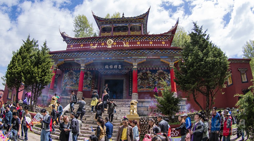 出亭數(shù)步,即可望見(jiàn)掩映在綠樹(shù)叢中的“吉祥禪院”,巍峨雄偉,金壁輝煌。進(jìn)得大殿,一尊釋迦牟尼塑像栩栩如生,四壁神畫(huà)多為佛經(jīng)故事。轉(zhuǎn)過(guò)側(cè)殿,就是高達(dá)二十余米的“凌云白塔”了。這座用白石作塔座,以金屬飾塔頂?shù)姆鹚桥荞R山公園主要景觀之一。