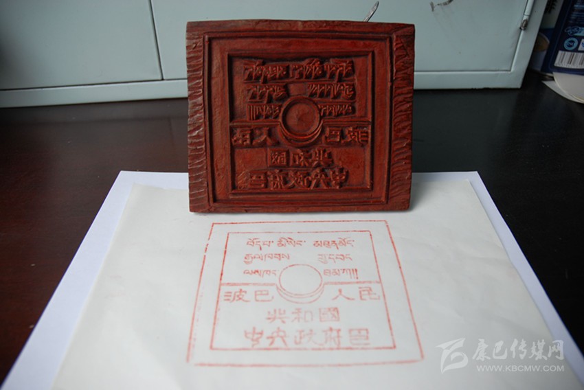 日月同輝的造型、藏漢雙語的文字,這一枚木質(zhì)印章,高1.5厘米,長寬皆為12厘米,印面刻著藏漢雙語“波巴人民共和國中央人民政府印”。