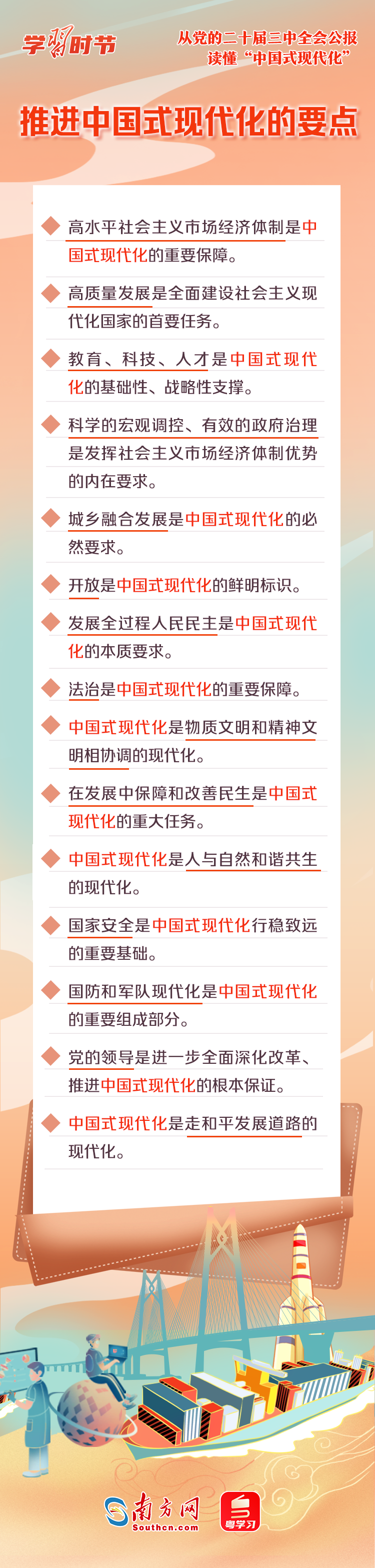 中國式現(xiàn)代化是中國共產(chǎn)黨和中國人民長期實(shí)踐探索的成果,是一項(xiàng)偉大而艱巨的事業(yè)。全會公報中,“中國式現(xiàn)代化”一詞被反復(fù)提及,深刻闡述了進(jìn)一步全面深化改革與推進(jìn)中國式現(xiàn)代化的關(guān)系,以及中國式現(xiàn)代化的重要保障、必然要求、本質(zhì)要求等重要內(nèi)容。一起來學(xué)習(xí)!