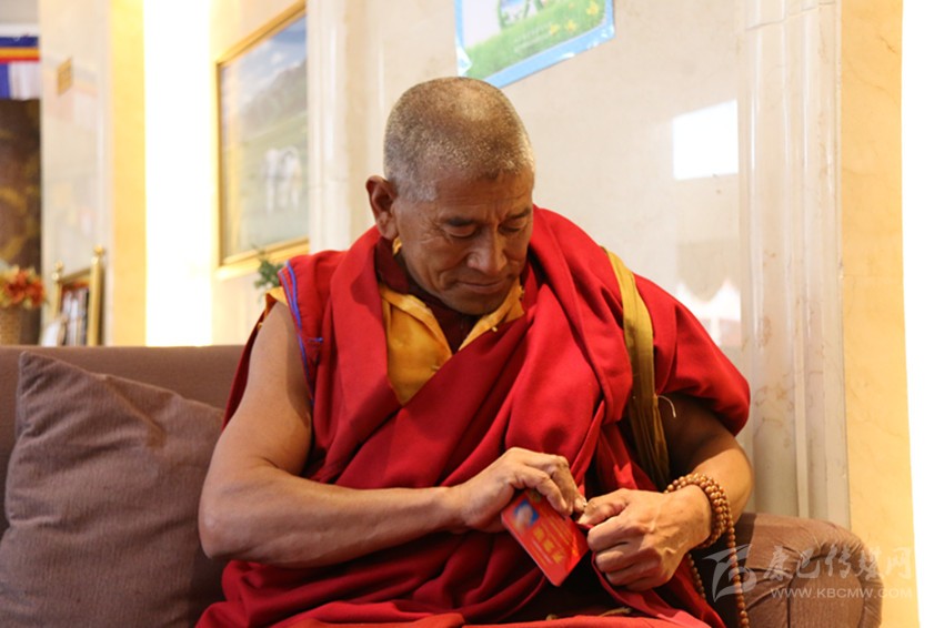 來自得榮縣的宗教界委員扎西鄧珠迫不急待的戴上出席證。