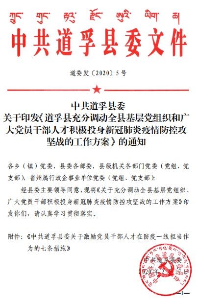 疾風知勁草,板蕩識誠臣。自新型冠狀病毒肺炎疫情防控阻擊戰(zhàn)打響以來,道孚縣各級黨組織和黨員、干部主動擔當作為,積極投入疫情防控最前線,為有力防控疫情蔓延作出重要貢獻。近日,道孚縣委印發(fā)《中共道孚縣委關于激勵黨員干部人才在防疫一線擔當作為的七條措施》,關心關愛、激勵引導廣大黨員、干部、各類人才在疫情防控一線履職盡責、擔當作為、安心戰(zhàn)斗。
