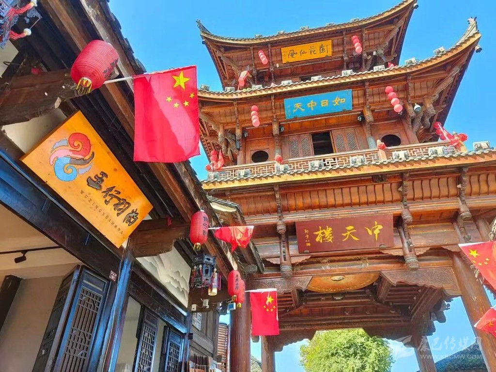 在南充古城閬中,以中天樓為核心鋪開的四條街道,全部被五星紅旗裝點開來,甚至部分街段上空鋪上了“紅旗?!?。新城的主干道,也掛上了一面面五星紅旗,站在街頭放眼望去,鮮艷的五星紅旗成為一道最靚麗的風景線。