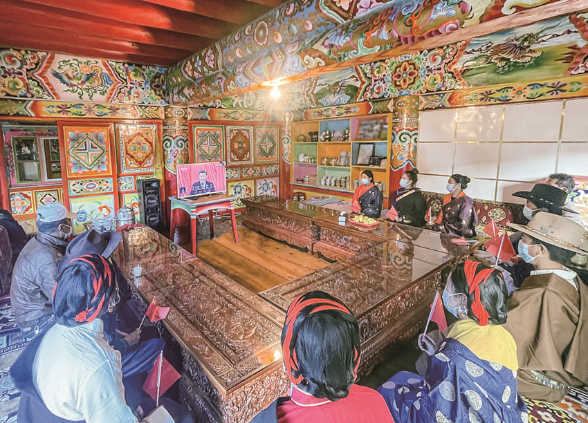 道孚縣麻孜鄉(xiāng)村民集中收看黨的二十大開(kāi)幕會(huì)。