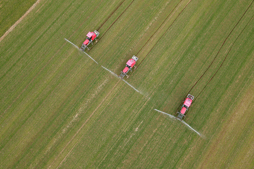 近日,安徽省蚌埠市五河縣頭鋪鎮(zhèn)村民搶抓農(nóng)時(shí)進(jìn)行小麥春管作業(yè),田間地頭一派農(nóng)忙景象。圖為2月14日,在安徽省蚌埠市五河縣頭鋪鎮(zhèn),農(nóng)民駕駛農(nóng)機(jī)給小麥噴灑農(nóng)藥(無人機(jī)照片)。