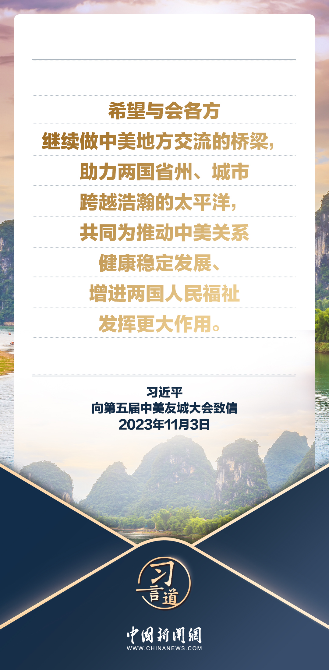11月3日,國(guó)家主席習(xí)近平向第五屆中美友城大會(huì)致信。習(xí)近平指出——