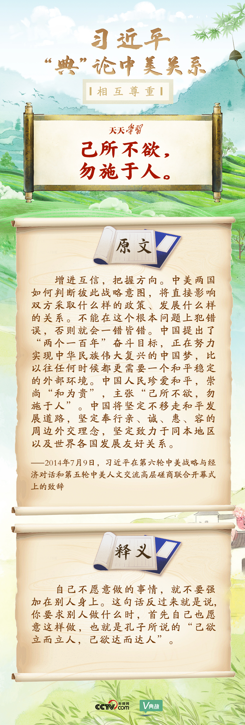 黨的十八大以來,習(xí)近平主席就中美關(guān)系發(fā)表了一系列重要講話。他站在時代高度分析、研判中美關(guān)系現(xiàn)狀及發(fā)展趨勢,并引經(jīng)據(jù)典為發(fā)展中美關(guān)系指出正確方向。這些論述蘊含深刻的戰(zhàn)略思維和政治智慧,具有重大現(xiàn)實意義和深遠歷史意義。央視網(wǎng)《天天學(xué)習(xí)》與您一起深刻領(lǐng)會。
