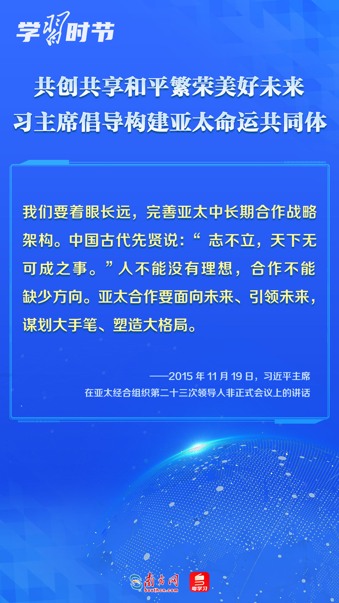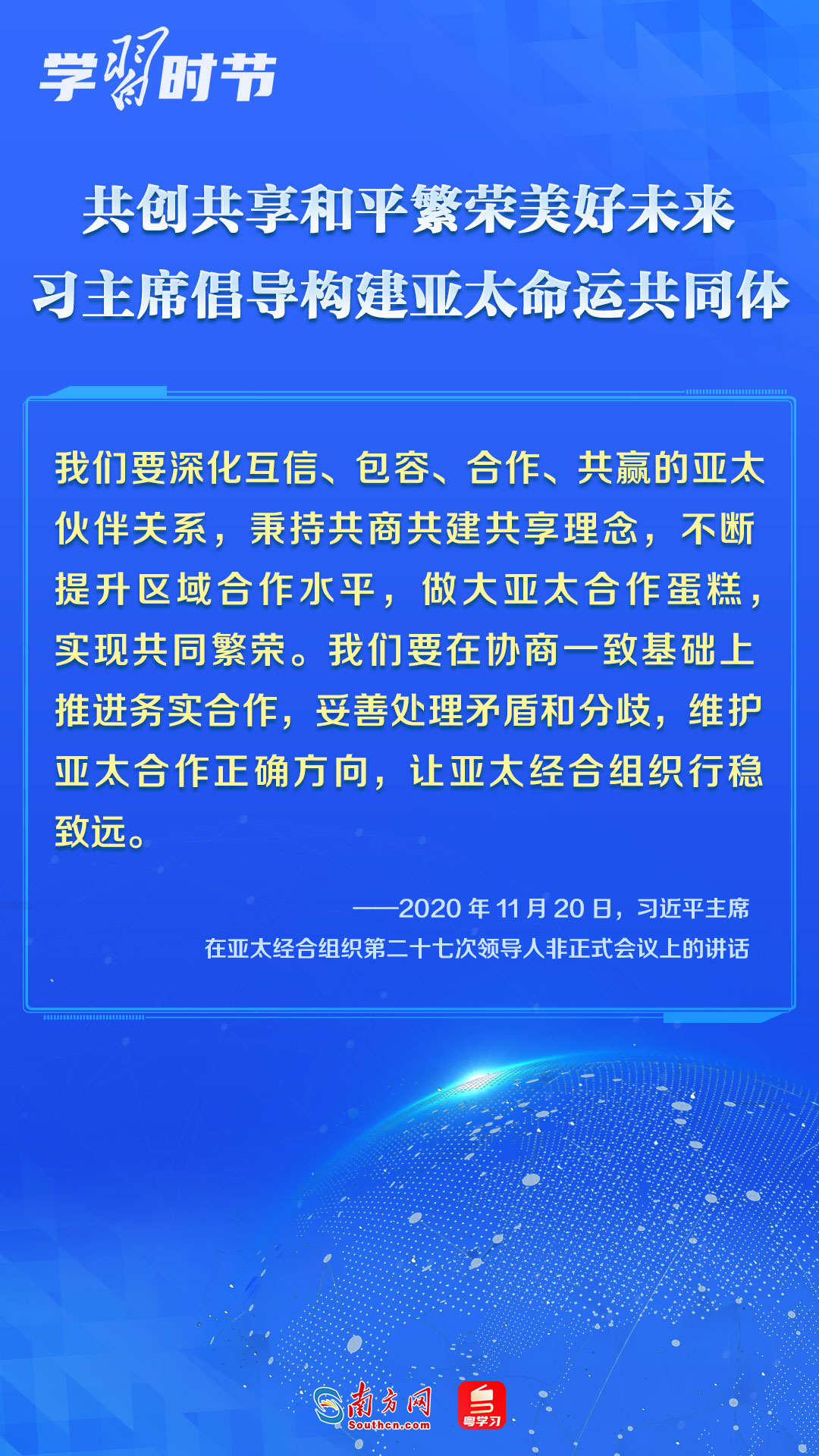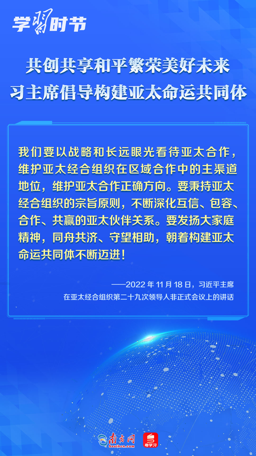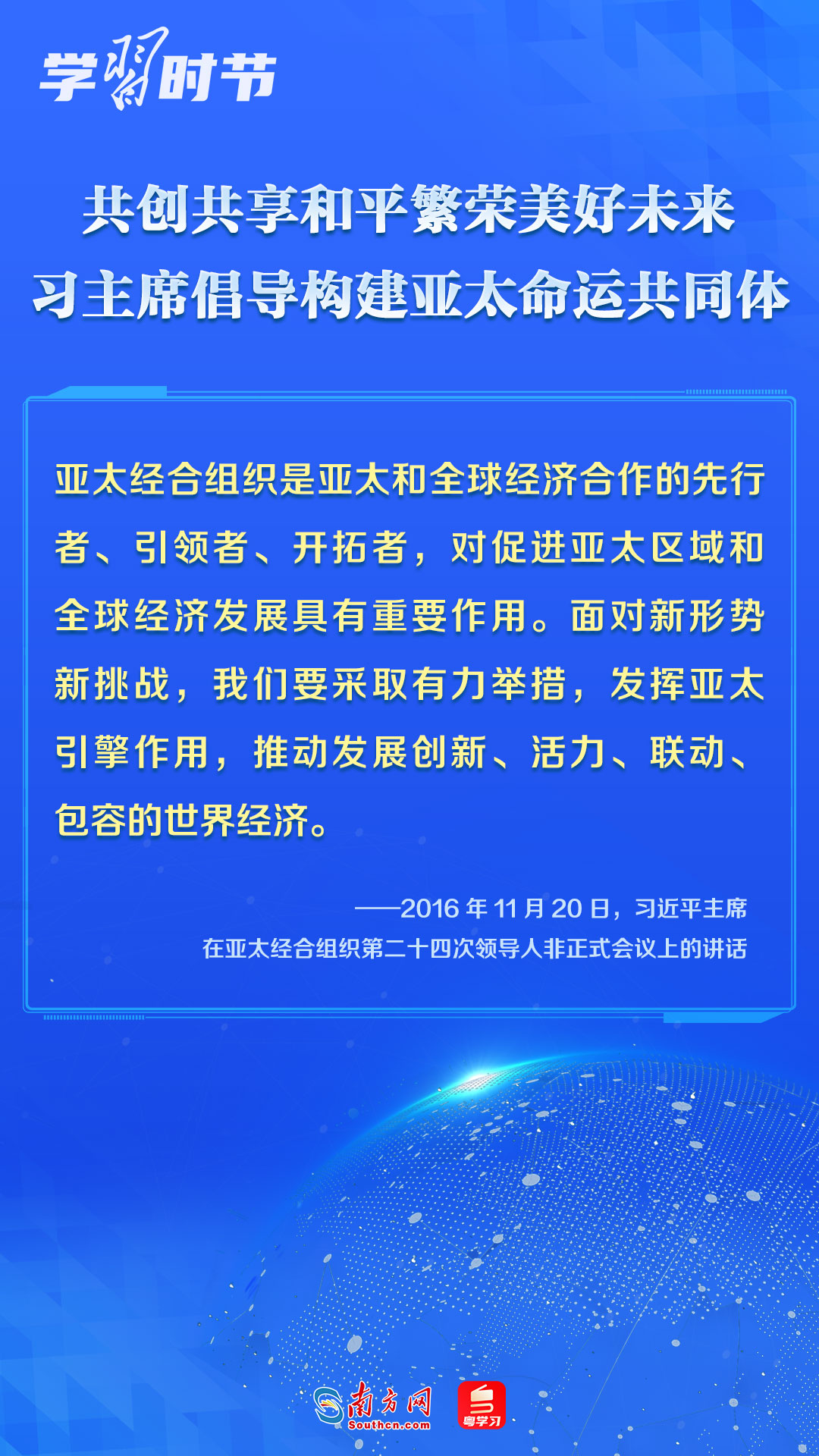 中國一直是APEC的積極參與者、貢獻者,為推動建設(shè)亞太大家庭發(fā)揮了重要作用。習近平主席多次出席APEC會議,以中國主張促進亞太合作,以中國貢獻推動亞太發(fā)展,以中國智慧凝聚亞太共識,多次闡述構(gòu)建開放包容、創(chuàng)新增長、互聯(lián)互通、合作共贏的亞太命運共同體的理念主張和重大意義,讓我們一同學習。