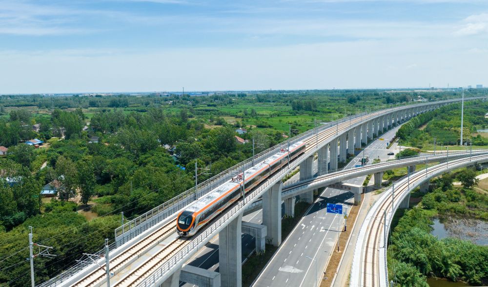 這是在安徽省滁州市來安縣境內拍攝的滁寧城際鐵路列車(2023年6月28日攝,無人機照片)。當日,滁寧城際鐵路滁州段開通運營。滁寧城際鐵路西起滁州高鐵站,止于正在規(guī)劃建設中的南京北站,全長約55公里。