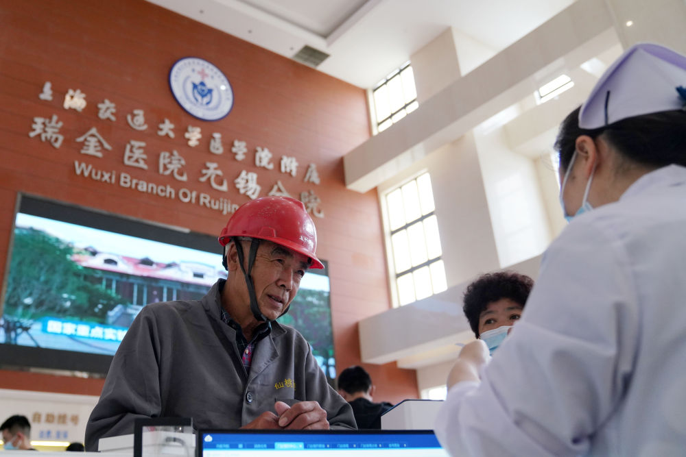 2023年5月18日,在位于江蘇省無錫市的上海交通大學醫(yī)學院附屬瑞金醫(yī)院無錫分院,就診者在服務臺咨詢。