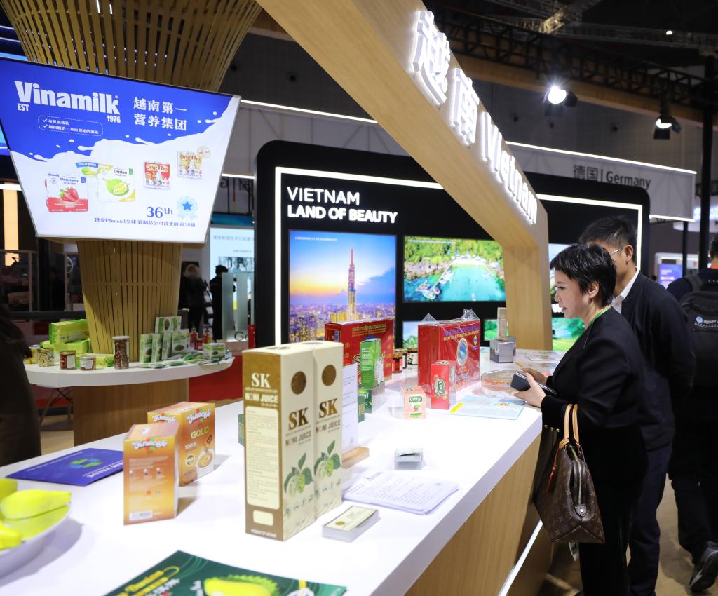 11月6日,參觀者在第六屆進(jìn)博會(huì)國家展越南展臺(tái)挑選商品。