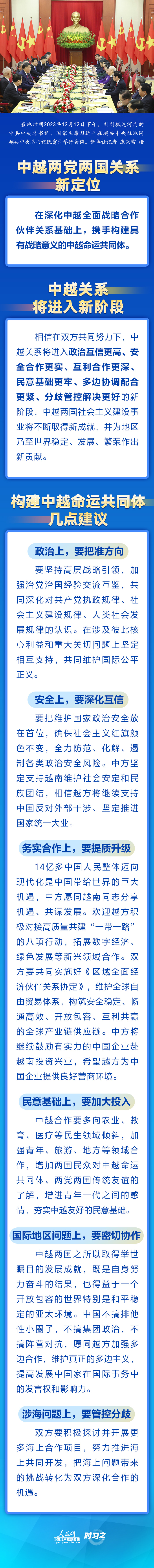 當(dāng)?shù)貢r間2023年12月12日下午,剛剛抵達(dá)河內(nèi)的中共中央總書記、國家主席習(xí)近平在越共中央駐地同越共中央總書記阮富仲舉行會談。雙方宣布中越兩黨兩國關(guān)系新定位,在深化中越全面戰(zhàn)略合作伙伴關(guān)系基礎(chǔ)上,攜手構(gòu)建具有戰(zhàn)略意義的中越命運(yùn)共同體。