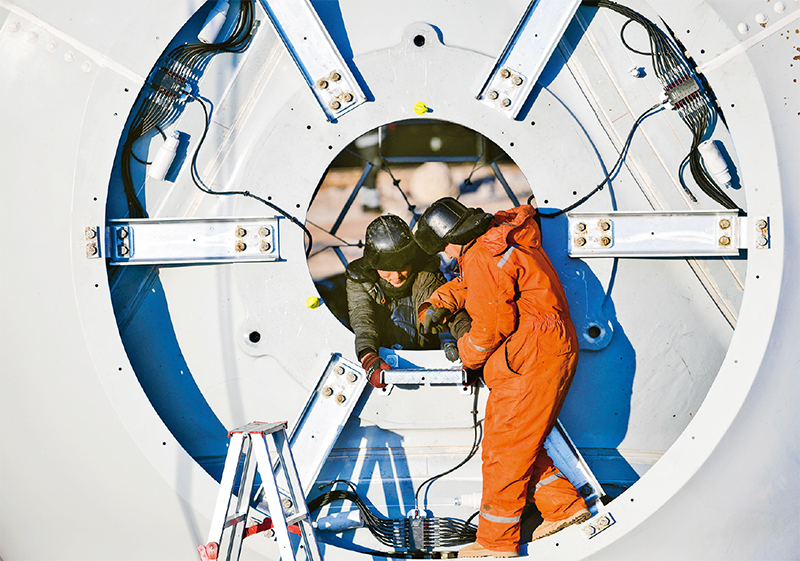 河北承德豐寧風(fēng)光氫儲100萬千瓦風(fēng)光項目是國家“十四五”規(guī)劃的大型清潔能源基地——冀北清潔能源基地的標志性工程。項目建成后,預(yù)計每年可生產(chǎn)綠電18億千瓦時,減少二氧化碳排放約140萬噸。圖為2024年1月12日,該項目的工人在安裝風(fēng)機輪轂配件。 新華社發(fā) 王立群/攝
