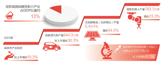 發(fā)展壯大戰(zhàn)略性新興產(chǎn)業(yè)?!皯?zhàn)略性新興產(chǎn)業(yè)具有創(chuàng)新活躍、技術(shù)密集等特點(diǎn),為新質(zhì)生產(chǎn)力發(fā)展壯大提供了巨大空間?!备呶拇碚f(shuō),近年來(lái),我國(guó)戰(zhàn)略性新興產(chǎn)業(yè)蓬勃發(fā)展,目前戰(zhàn)略性新興產(chǎn)業(yè)占GDP比重約13%。