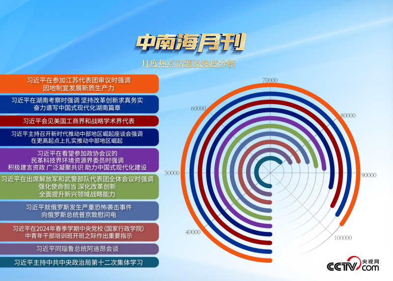 央視網(wǎng)“智聞”系統(tǒng)提取分析2024年3月全網(wǎng)時(shí)政新聞熱點(diǎn)顯示,“習(xí)近平總書(shū)記在湖南考察”“新時(shí)代推動(dòng)中部地區(qū)崛起座談會(huì)”等相關(guān)話題備受關(guān)注。
