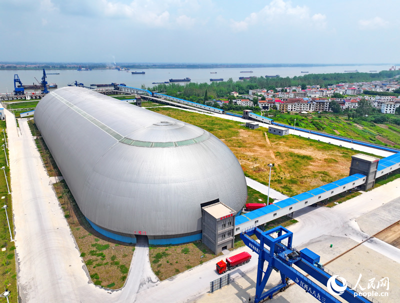 位于九江柴桑區(qū)的九江港赤湖作業(yè)區(qū)公用碼頭的“膠囊”倉庫,是全國第二個(gè)、江西首個(gè)新型智慧散貨碼頭。人民網(wǎng) 朱海鵬攝