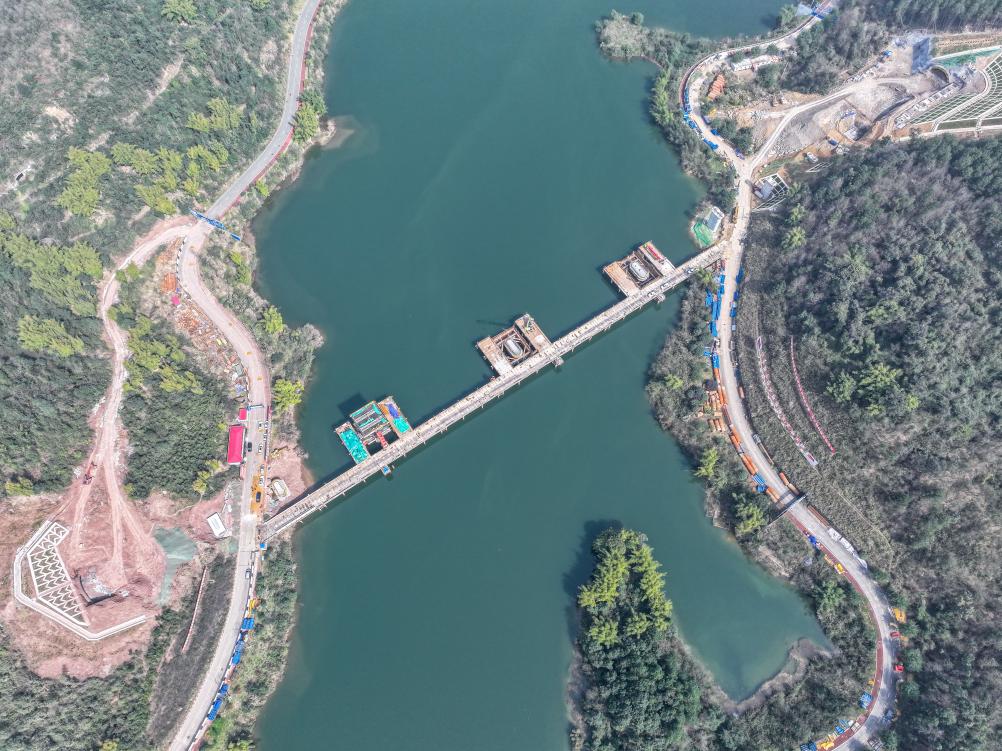 ??這是2月19日拍攝的位于重慶市銅梁區(qū)的成渝中線高鐵玄天湖大橋建設(shè)現(xiàn)場(無人機(jī)照片)。新華社記者 唐奕 攝
