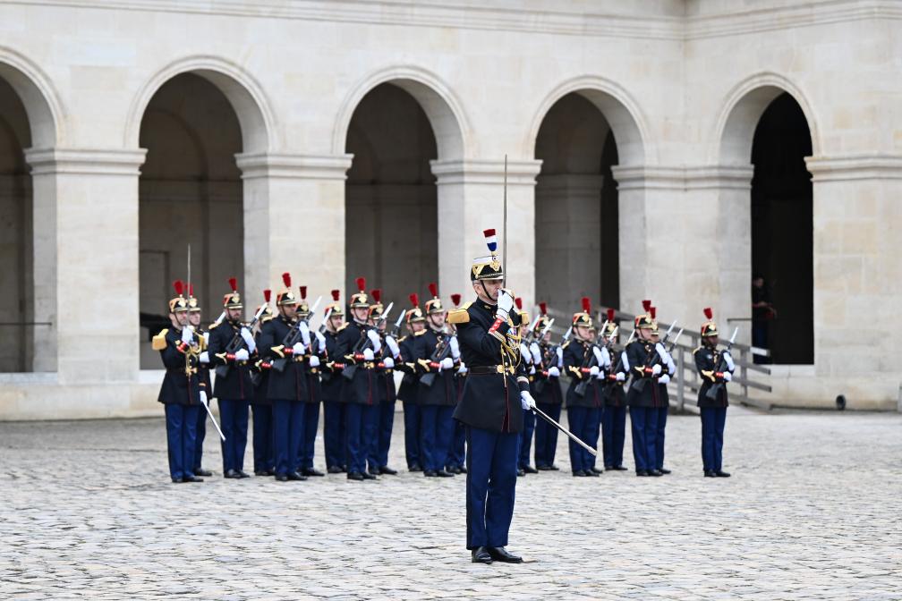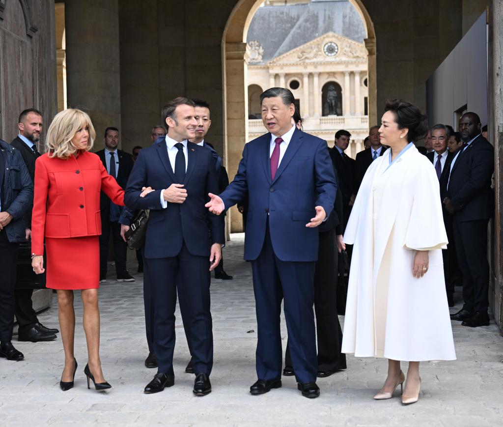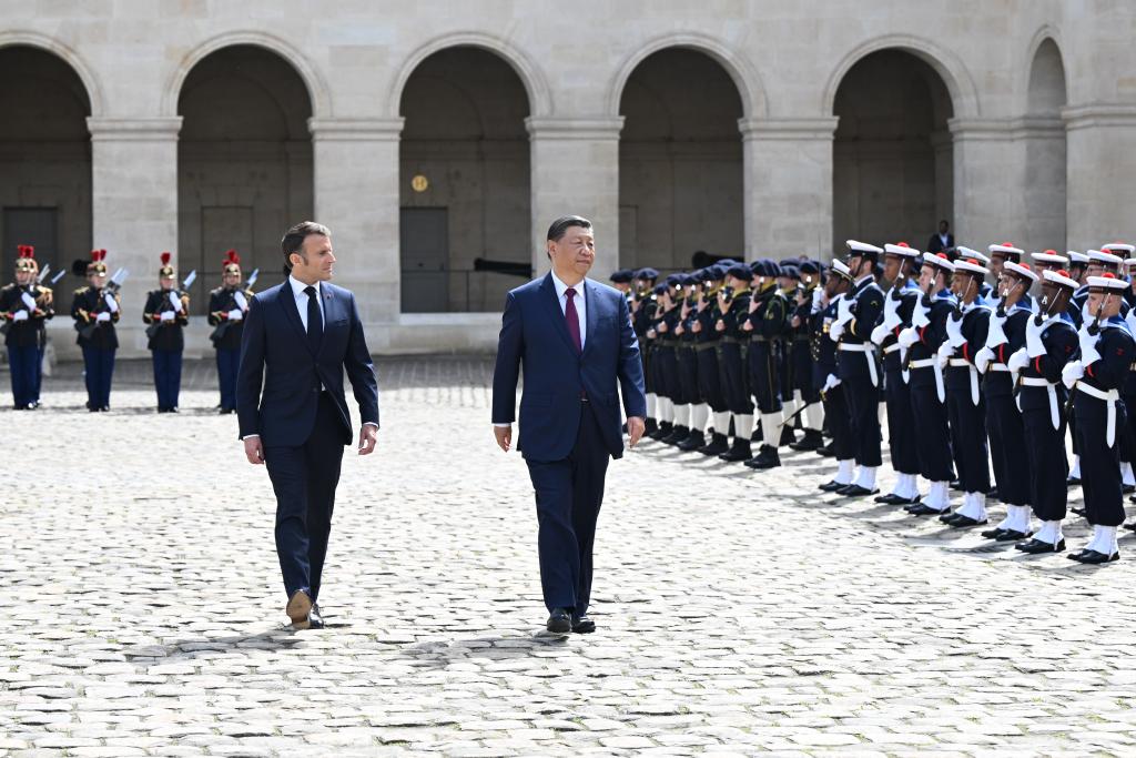 ??當(dāng)天下午,習(xí)近平在巴黎出席馬克龍舉行的隆重盛大歡迎儀式。兩國(guó)元首檢閱法蘭西共和國(guó)衛(wèi)隊(duì)和陸??杖妰x仗隊(duì),并觀看分列式。