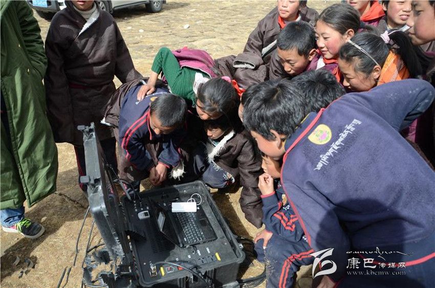 孩子們圍坐在國家電網(wǎng)四川電力公司前的便攜式衛(wèi)星通訊設備,與另一方連線的人進行視頻聊天。