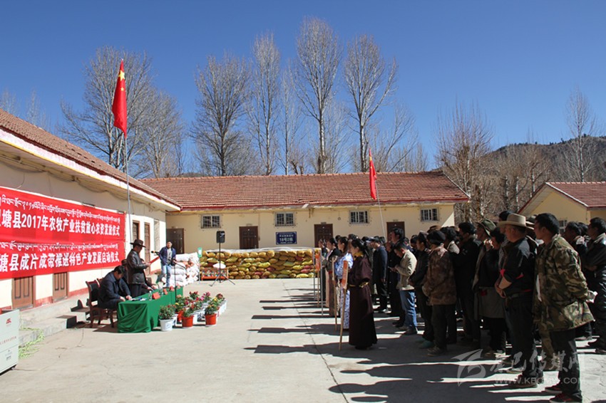 在農(nóng)科所院壩,擺放著縣委政府多方籌資,縣農(nóng)牧和科技局調(diào)運(yùn)和貯備脫毒馬鈴薯種60萬公斤,青稞良種30萬公斤、農(nóng)膜10噸、肥料120噸、各類蔬菜油菜良種3000公斤,35萬元的黑木耳菌種,分發(fā)給24個(gè)鄉(xiāng)鎮(zhèn)、37個(gè)脫貧村。為趕這趟“理塘縣2017年農(nóng)牧產(chǎn)業(yè)扶貧放心農(nóng)資發(fā)放儀式”、“理塘縣成片成帶推進(jìn)特色產(chǎn)業(yè)發(fā)展啟動儀式”,降央吉稱專門起了個(gè)大早,開著拖拉機(jī)“趕”了兩個(gè)小時(shí)到了農(nóng)科所。