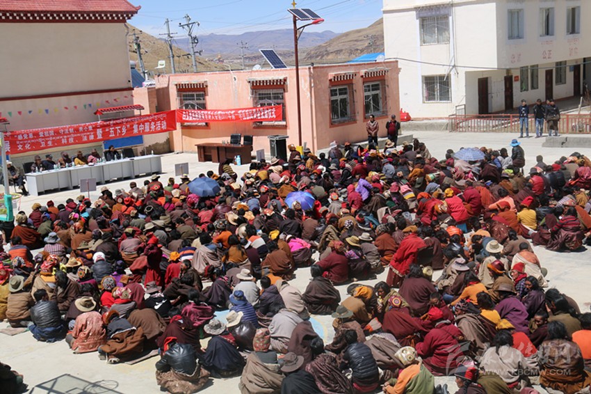 白玉縣牧區(qū)納塔鄉(xiāng),高原烈日下,1000多牧民和僧人盤腿坐在地上,聚精會(huì)神聆聽,麥克風(fēng)里傳出抑揚(yáng)頓挫的藏語,本地諺語、民間故事配合著扶貧政策、法律法規(guī),通過一個(gè)個(gè)生動(dòng)的比喻,回響在牧民耳畔。