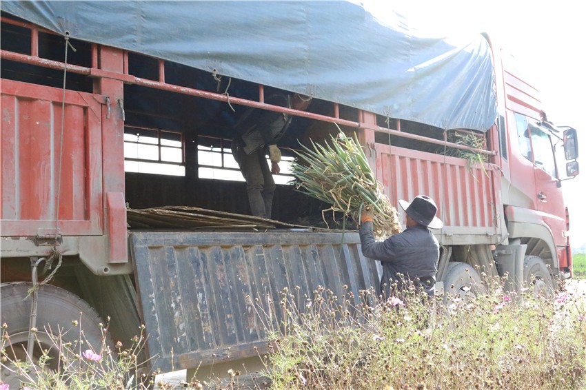 筆者看到,充翁格美熟練地先用鏟子從田地的側(cè)面挖下去2寸深,將大蔥拔出來撣去根須的泥土,然后將斷根的、中等的、大的大蔥分別堆放,每15斤左右打捆,每10捆過稱后搬運(yùn)裝車。據(jù)他介紹,現(xiàn)在基地的大蔥每周要裝兩次車,每次裝10噸。
