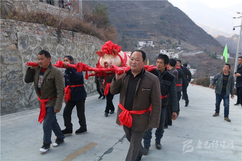 5個(gè)村民將年豬抬到秤上。360斤。村民為年豬準(zhǔn)備大紅花。準(zhǔn)備紙錢、香蠟。9點(diǎn)整,殺豬匠開始了他的工作,在眾人齊心協(xié)力下,光溜溜的年豬被打整干凈?!氨S游覀兇鍋砟觑L(fēng)調(diào)雨順、五谷豐登,村民平安健康。”村中老者敬過天地后,8個(gè)身強(qiáng)力壯的村民站在年豬旁,豎著拇指齊聲說,今年家家戶戶還要養(yǎng)大肥豬。抬著年豬,村里的中老年人簇?fù)碇?,走在最前面,唱著悅耳的民謠,大意是歌唱幸福生活的,迎著2018年的第一縷陽光,村民們喜氣洋洋。到村里來的游客蜂擁拍照。