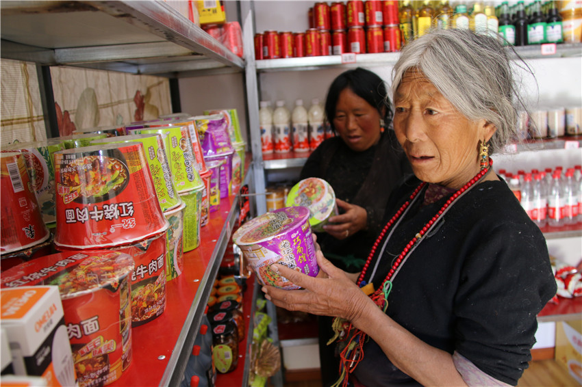 貨架上的貨物琳瑯滿目,價格與縣城大超市一分不差,還節(jié)省了路途奔波。“家門口就能買到東西,還又好又便宜,安逸。開展精準扶貧,硬是為大家解決了大困難?!?村民格瑪拉措道出了村民們的感激。大家共同商議決定把這超市叫做“洛蝦村感恩超市”。
