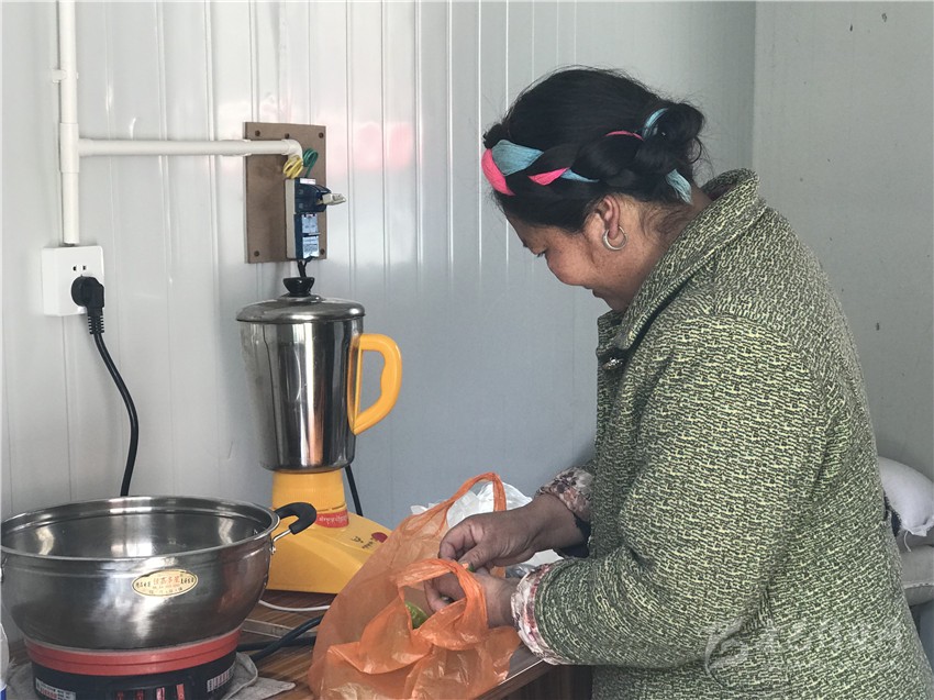 卓瑪在板房新家里忙碌。