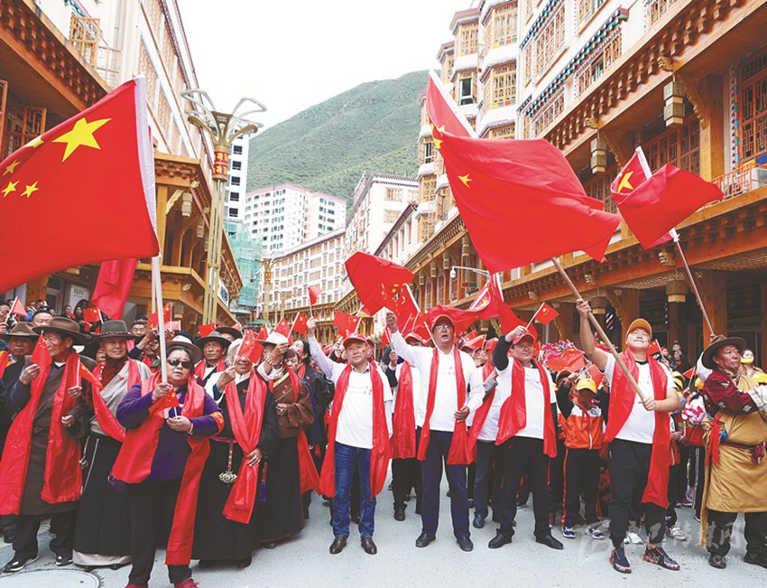 伴隨著悠揚(yáng)的旋律,在當(dāng)?shù)馗袼_爾藝術(shù)團(tuán)演員的帶領(lǐng)和感染下,幾千名當(dāng)?shù)馗刹咳罕娚碇A服,揮舞著手中的五星紅旗,懷著無(wú)比激動(dòng)的心情獻(xiàn)歌祖國(guó),同唱《我和我的祖國(guó)》。深情激昂的歌聲感染到在場(chǎng)的每一個(gè)人,有的高呼喝彩、有的熱淚盈眶,齊聚在鮮紅的國(guó)旗下,齊聲高喊:“我愛(ài)祖國(guó),祖國(guó)萬(wàn)歲!”