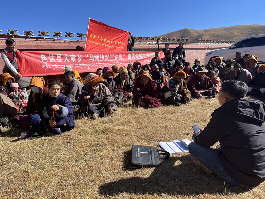 “針對(duì)色達(dá)高寒偏遠(yuǎn)、地廣人稀,牧區(qū)群眾生活居住較分散的情況,我們調(diào)配縣鄉(xiāng)村三級(jí)紀(jì)檢監(jiān)察力量,逐步組建起精通藏漢雙語(yǔ)、熟悉紀(jì)法知識(shí)、擅長(zhǎng)群眾工作的馬背執(zhí)紀(jì)宣講隊(duì),把黨的聲音傳遞到云端藏寨、天邊牧場(chǎng)?!鄙_(dá)縣紀(jì)委書(shū)記、監(jiān)委主任陳玉龍介紹,黨的二十大以來(lái),宣講隊(duì)已開(kāi)展宣講活動(dòng)20余場(chǎng)次,推動(dòng)為群眾辦實(shí)事10余件,解決困難訴求20件。