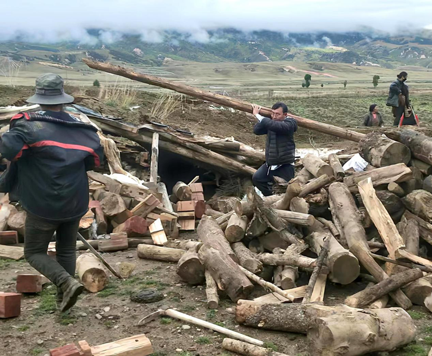 圖為李章權(quán)幫助村民搬運(yùn)木料。