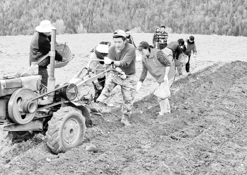志愿者們認(rèn)真領(lǐng)會播種要領(lǐng),深入田地,依次排開,相互配合著耕地、播種、施肥。增德村監(jiān)測戶鄭呷感激地說:“太感謝鄉(xiāng)里的干部了,我們家就2人,勞動力只有我一個,以前家里的地至少要一周才能種完,這次有你們幫忙,用一天的時間就種完了。”