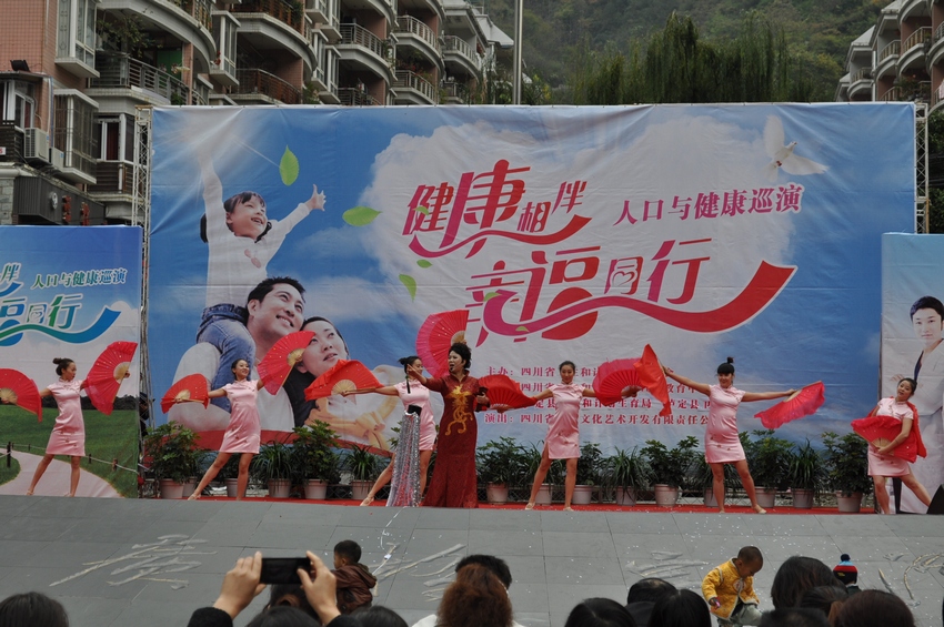舞臺上“健康相伴•幸福同行”大型演出背景格外醒目,由省虹宇藝術(shù)團(tuán)自編自演的舞蹈《歌舞青春》、金錢板《怪哪個》、小品《你生不生》、四川清音《分級診療就是好》、雜技《烏依人》、戲曲《天府奇葩》等節(jié)目陸續(xù)登場。演員們通過戲曲、歌曲等形式,向廣大觀眾傳播衛(wèi)生計生新政策,臺下各縣屬醫(yī)療衛(wèi)生計生機(jī)構(gòu)醫(yī)務(wù)人員免費開展義診活動,為廣大群眾查血壓、詢問病史、咨詢等忙個不停,群眾與演員互動場面感人。演出活動取得良好的教育效果,得到廣大群眾的熱烈歡迎。